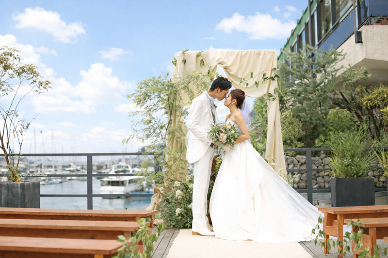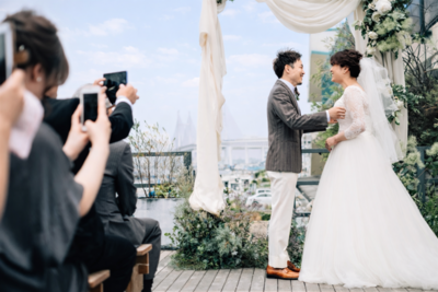ウッドデッキから広がるオーシャンビュー、その先にはベイブリッジも一望出来る景観を背に、会場内の装飾とコンセプトを統一させた会場で大切なゲストの前でご自身の言葉で誓いを交わしましょう。