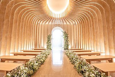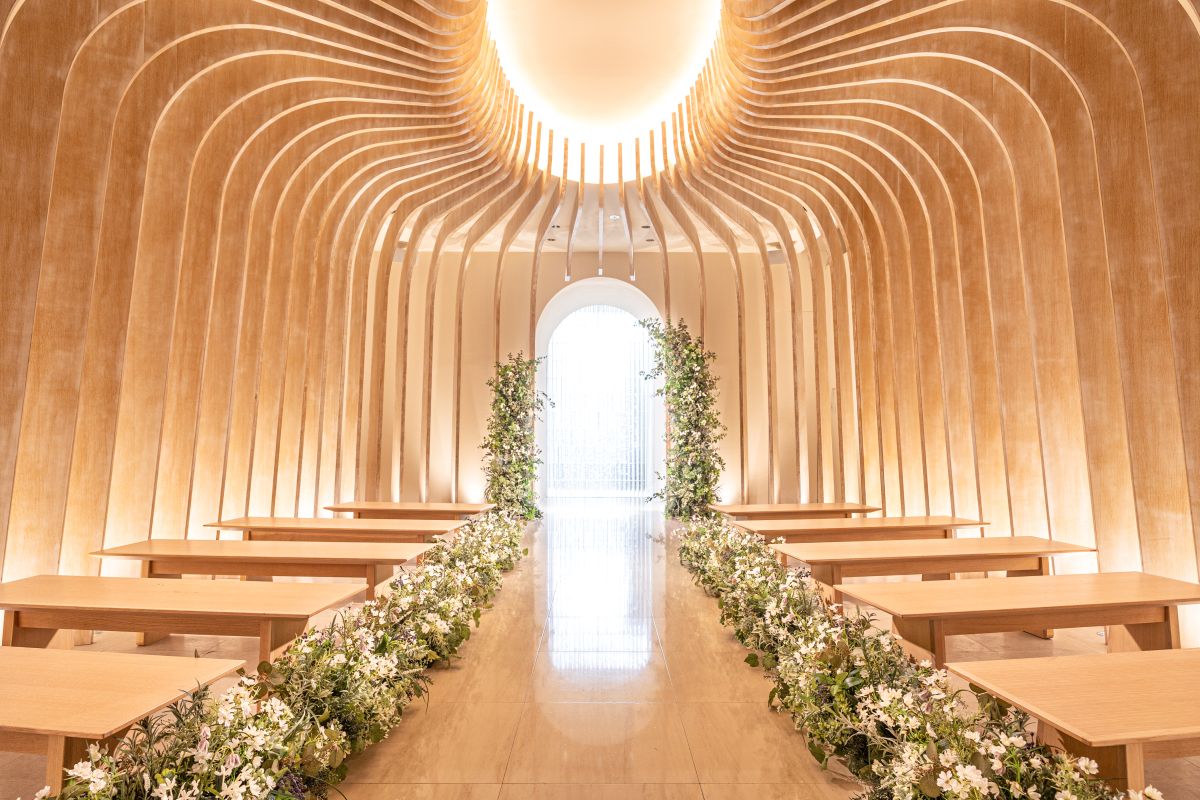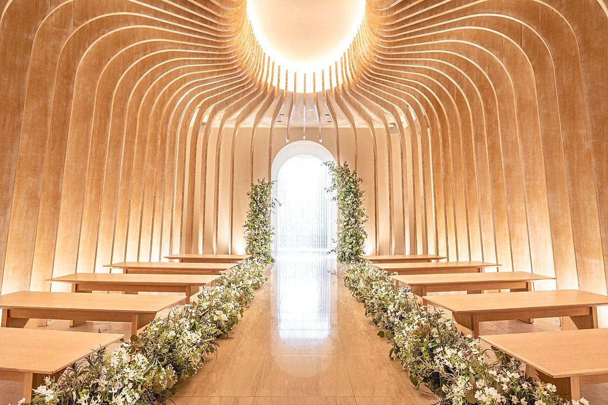丸の内駅からすぐの好立地。2023年にリニューアルしたチャペルは木の温もりと自然光が心地よい空間です。