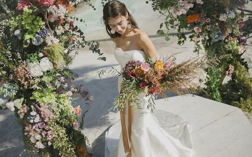デザイン・パターン、縫製まで全てアトリエで、一着ずつ思いをこめ仕上げた一点もののドレス。花や果物などのモチーフのアンティークレースや繊細な刺繍を使った、やわらかく上品で洗練されたデザインが特徴です。